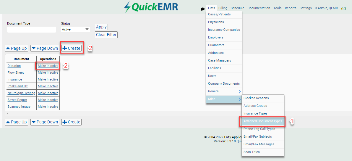 2. Once under Attached Document Type, Click Create or Make Inactive to delete