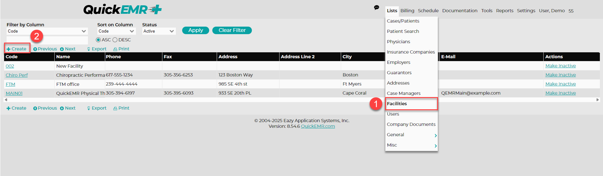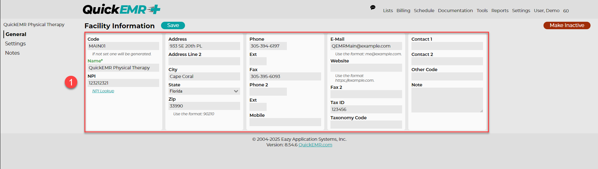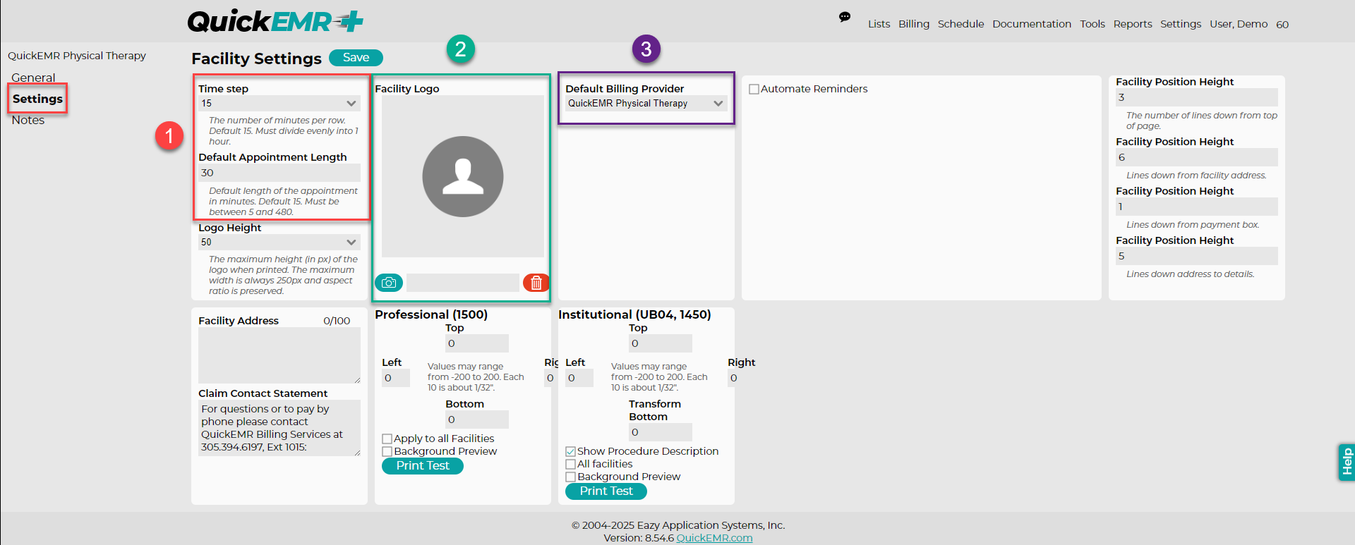 Manage or Add a Facility - Logo, Default Billing Provider and Appointment Length.