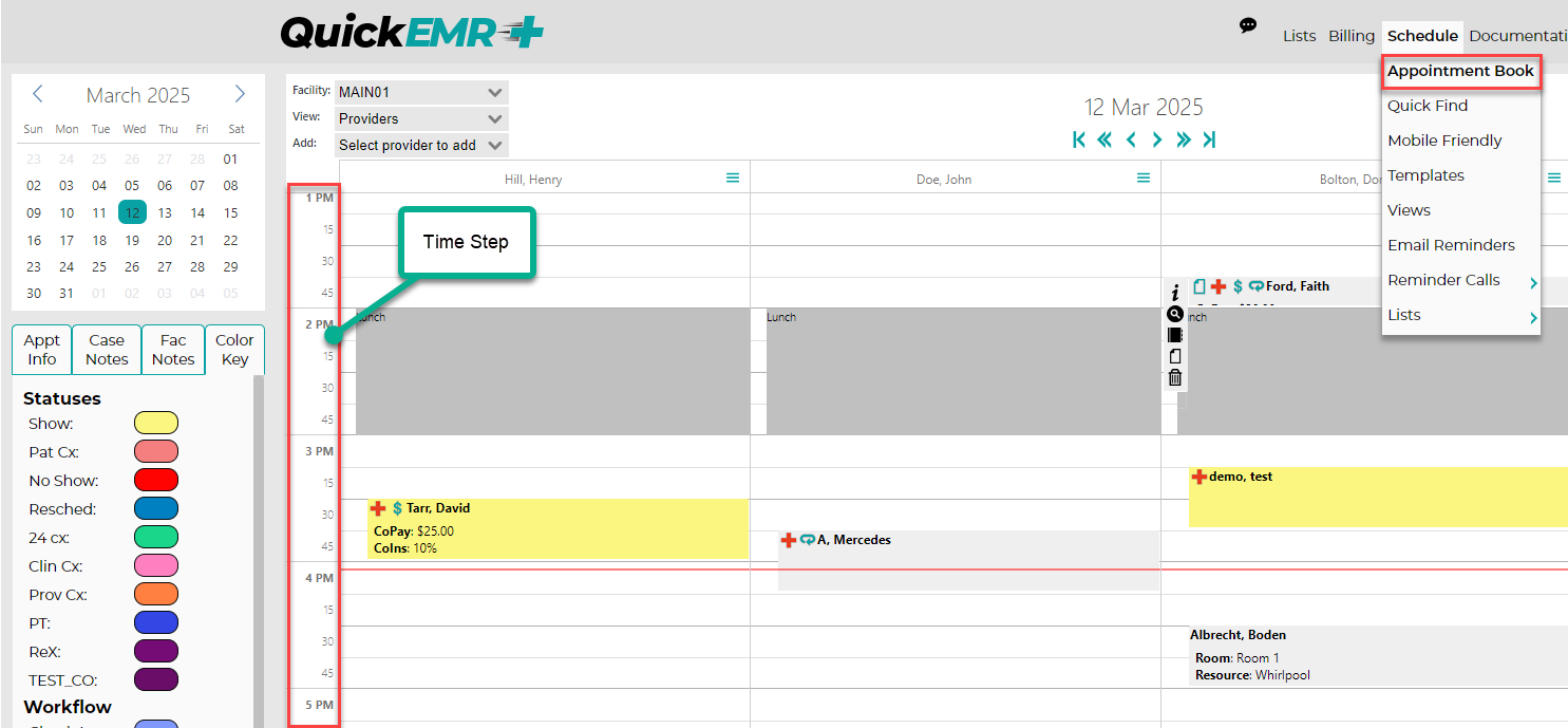 1. Time Step-updating the time step will change the time intervals on the appointment book located on the left