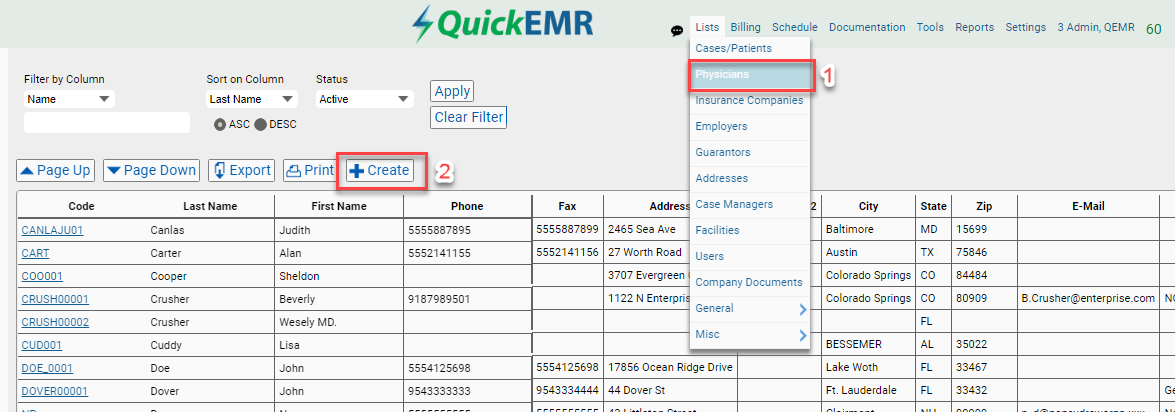 1. Users may manage their referring physicians under List->Physicians. 2. Once under the physicians List, hit create to add a new physician or click the code to open the settings