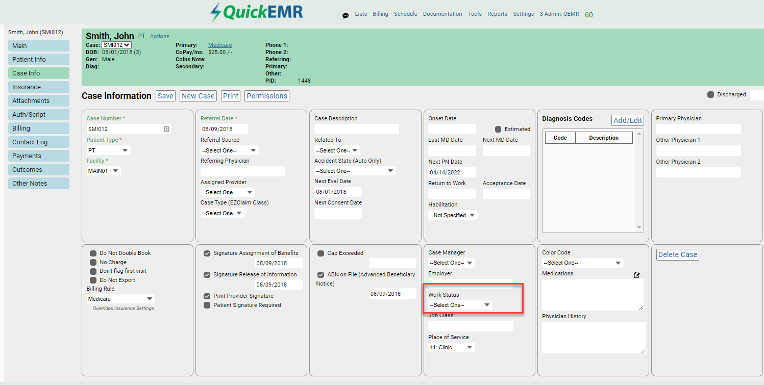 1. Work status can be selected for a patient's chart under the Case Info tab