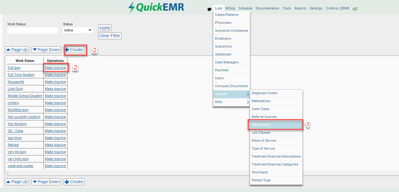 2. Once under Work Status, Click Create or Make Inactive to delete