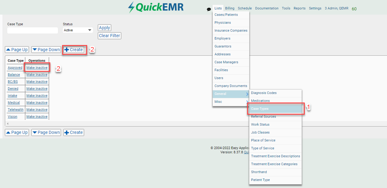 2. Once under Case Types, Click Create or Make Inactive to delete
