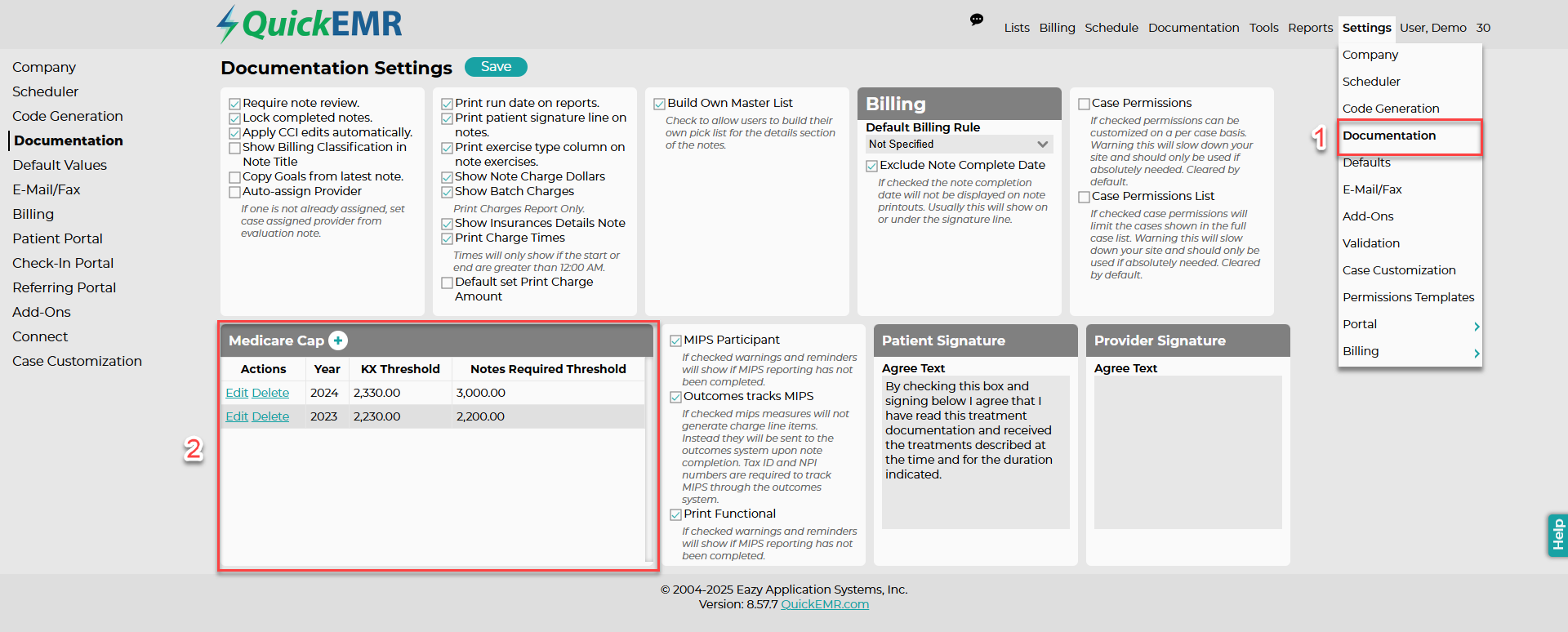 1. The Medicare Cap can be specified for the current year under Settings ->Documentation