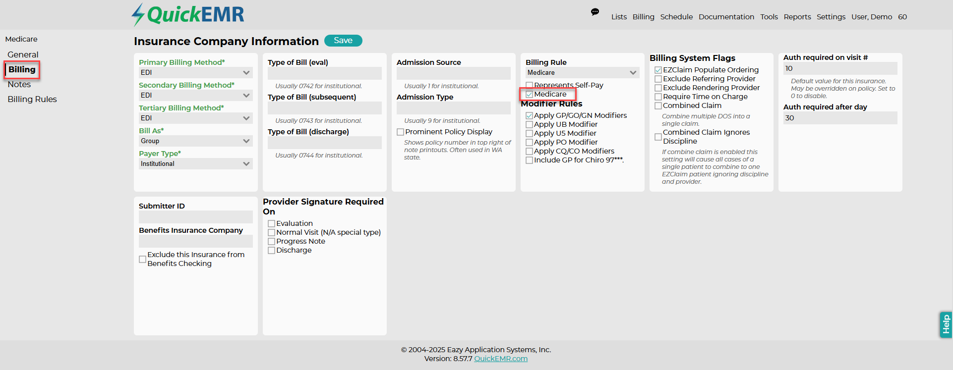 Insurance Settings: Ensure that the Insurance has the Medicare box check marked.