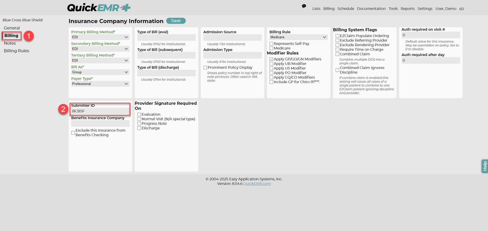 After saving any changes select the "Billing" tab on the left. Make sure the "Payer Type" correctly reflects the institutional or professional settings.