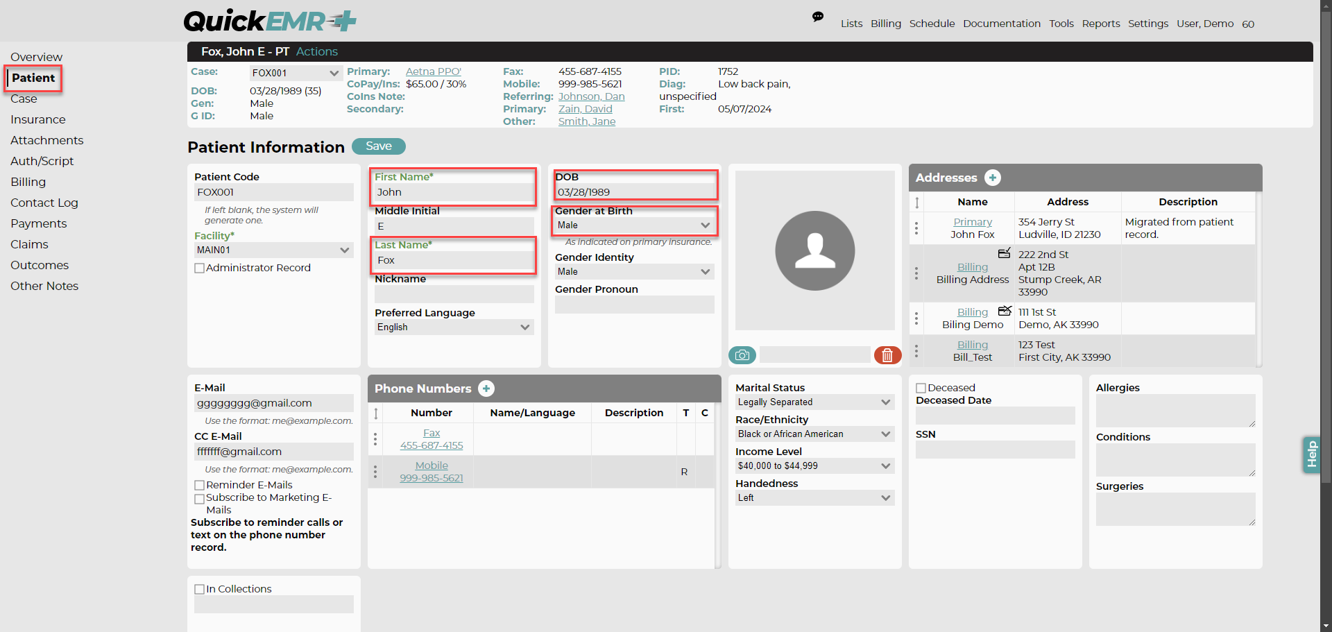The patient record must have the correct First & Last Name and Date of Birth that matches their insurance policy. Occasionally a payer may require the Gender as well.
