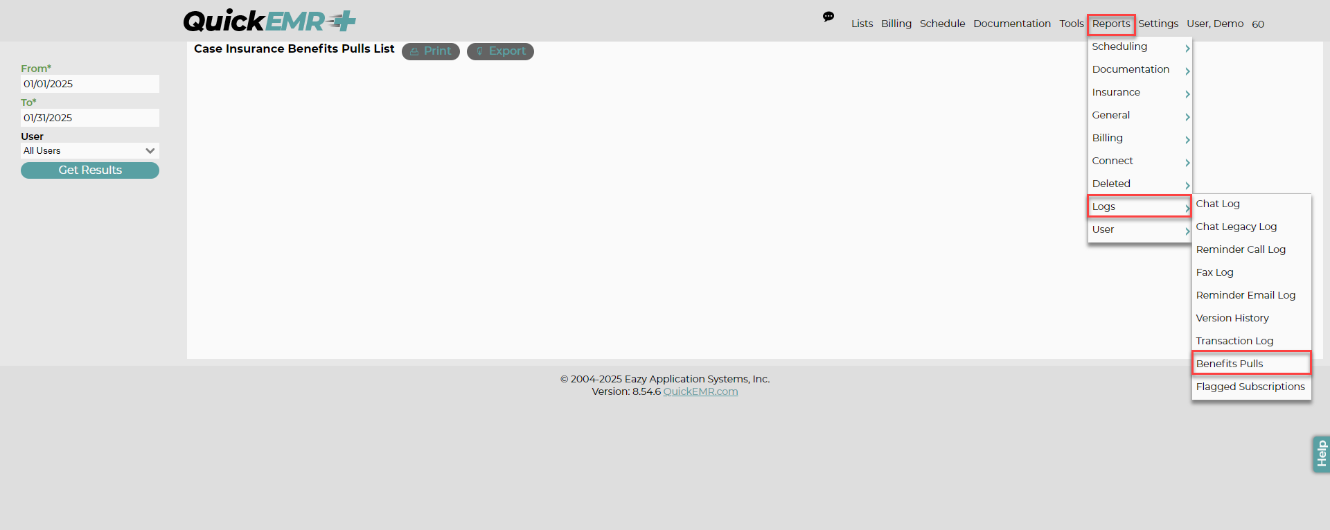 QuickEMR has added a report to support this feature. The Benefits Pulls report allows the user to get an estimate of how many transaction they have been or will be charged for. This report is located at Reports => Logs => Benefits Pulls. Set the date range you wish to inquire about and all pulls performed on your practice will be listed. Practices will only be charged for pulls performed by their own users with the success or pending status. Pulls performed by the QuickEMR support and billing teams are not charged to the client. A summary of the expected number of pulls being charged will be listed at the top of the results and each line item will also list charge or no charge on the cost column.