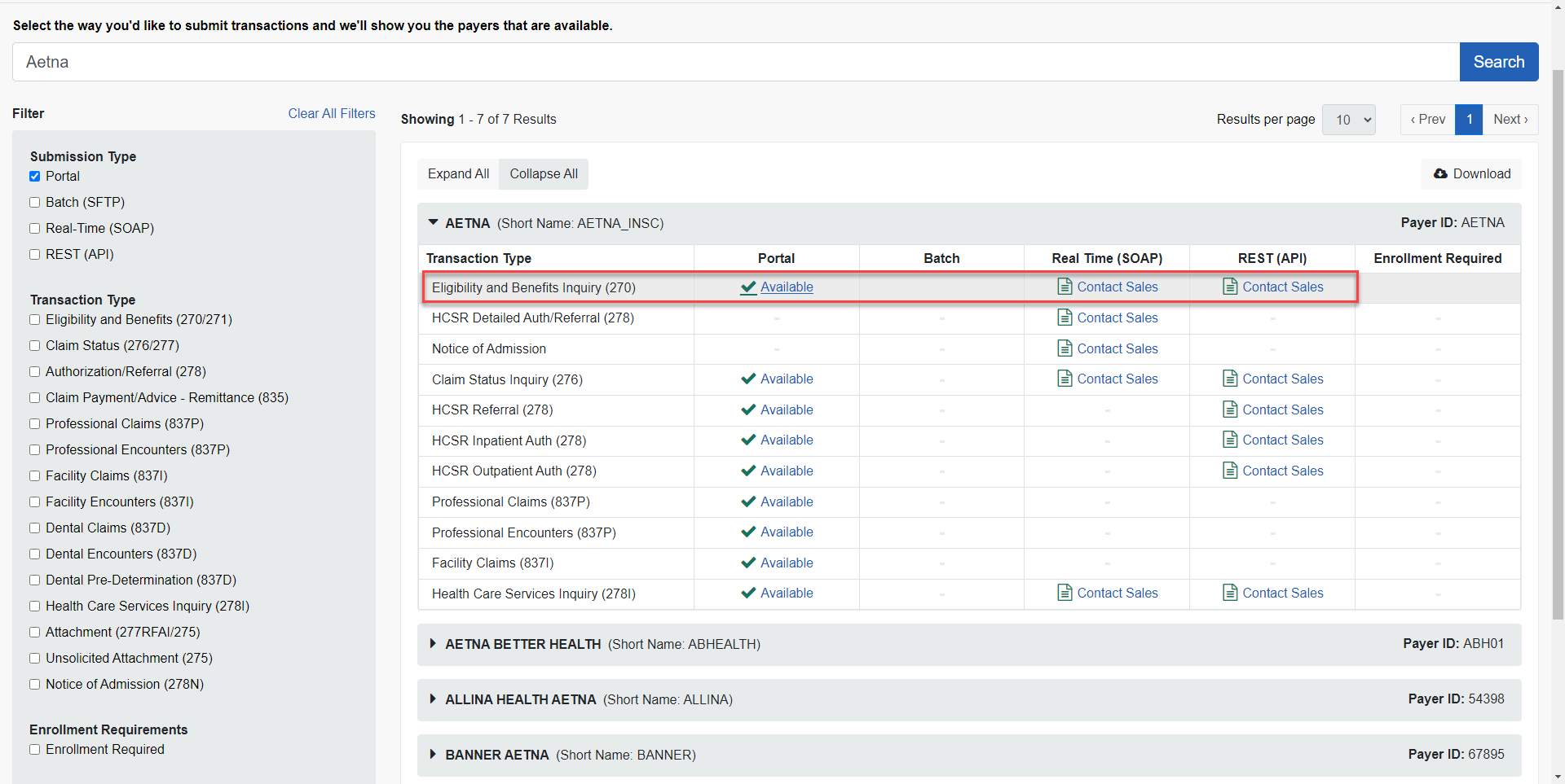 QuickEMR uses Availity, a 3rd party clearinghouse, to obtain the Eligibility & Benefits information. The list of supported providers occasionally changes and an updated list may be found on their online payer look-up tool. In submission type select "REST (API)" and under transaction type select "Eligibility and Benefits (270/271)".