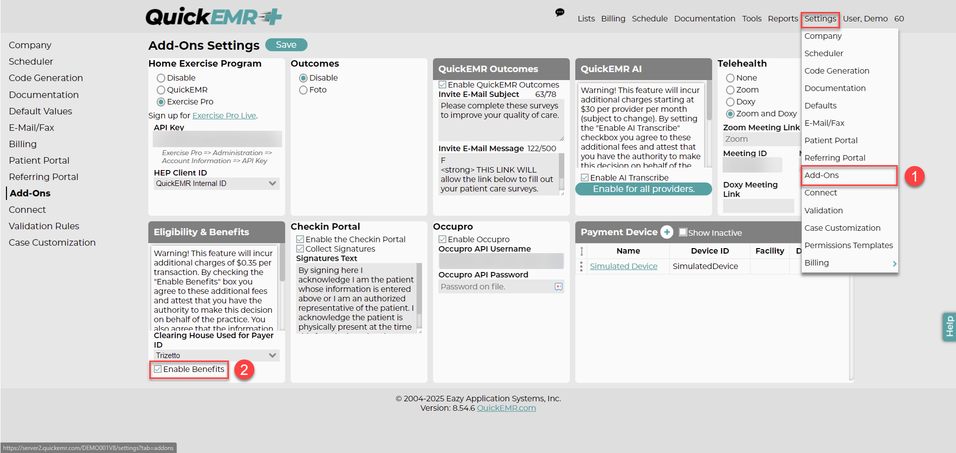 The benefits and eligibility check do incur an additional charge per transaction. To agree to the new charges and enable the feature visit "Settings" => "Add-Ons". Under the Eligibility & Benefits section select the clearinghouse you use to set your Payer ID's. If your Clearinghouse is not listed let us know by clicking on the "HELP" widget on the right, and please include a URL to the publicly accessible website of your clearinghouse. We will add additional clearinghouses as we get your feedback. If you do not use a clearinghouse select "No Clearinghouse". Then, if you agree to the terms and the pricing, set the "Enable Benefits" checkbox and save the page.