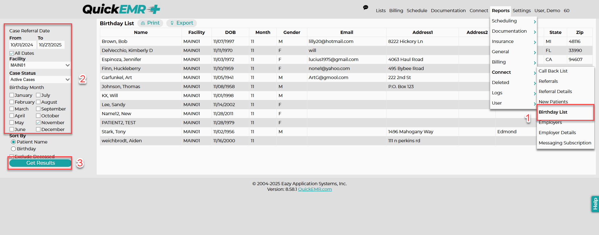 QuickEMR provides a Birthday List Report that allows you to view all patients with birthdays in a selected month. This report includes key contact details—such as email addresses and mailing addresses—making it easy to send greetings, reminders, or special communications to your patients.