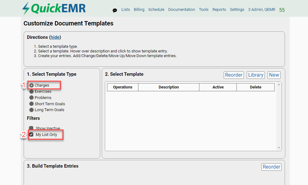 1. Users will be able to manage their charges template under Documentation-> Templates