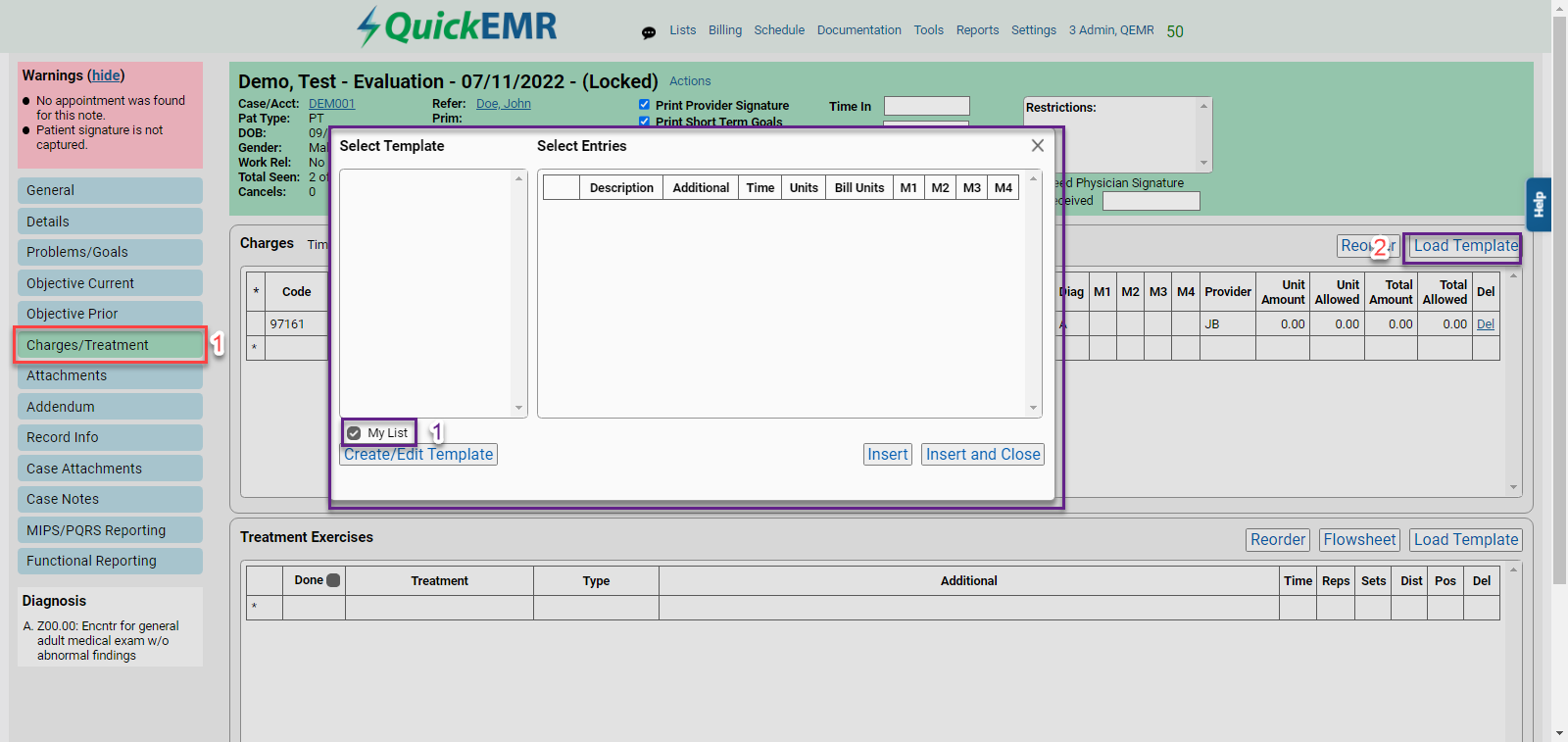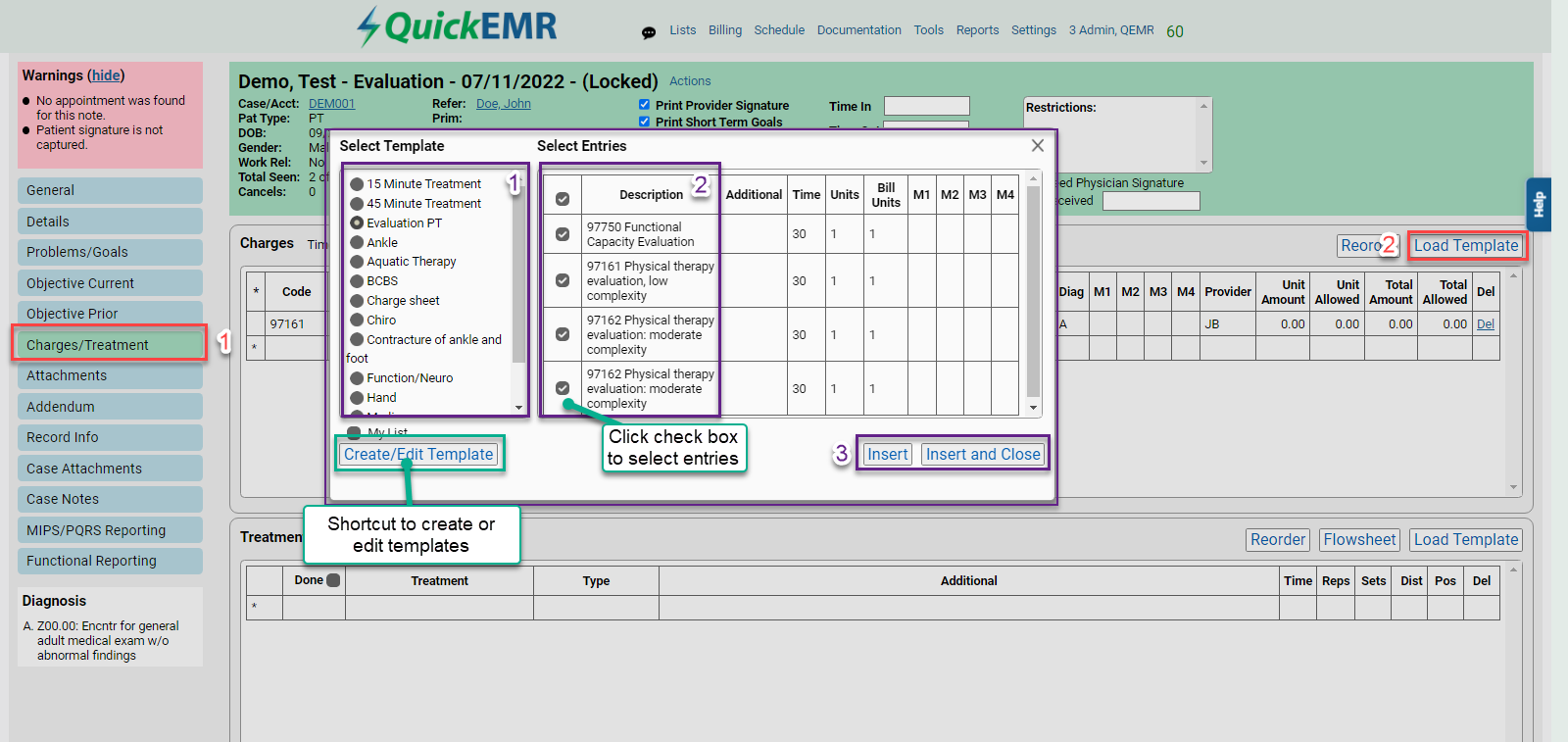 1. Navigate to the Charges/Treatment tab 2. Click Load Template under charges Template menu will display 1. Select Template 2.Select Entries (click the top check box to select/deselect all entries) 3. Insert Entries