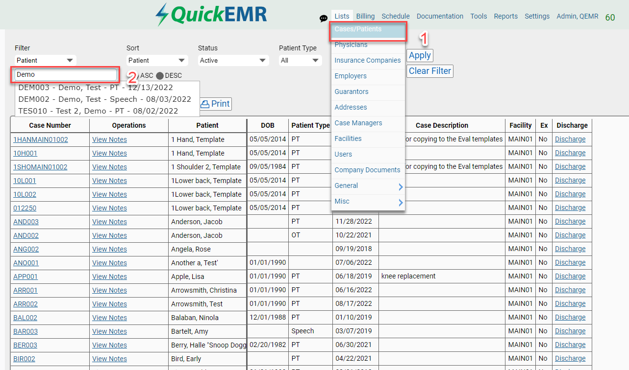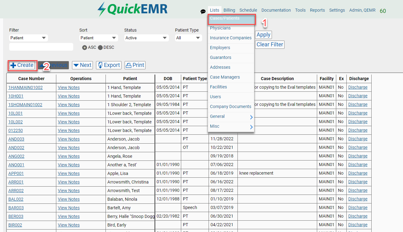1. Navigate to List->Cases/Patients