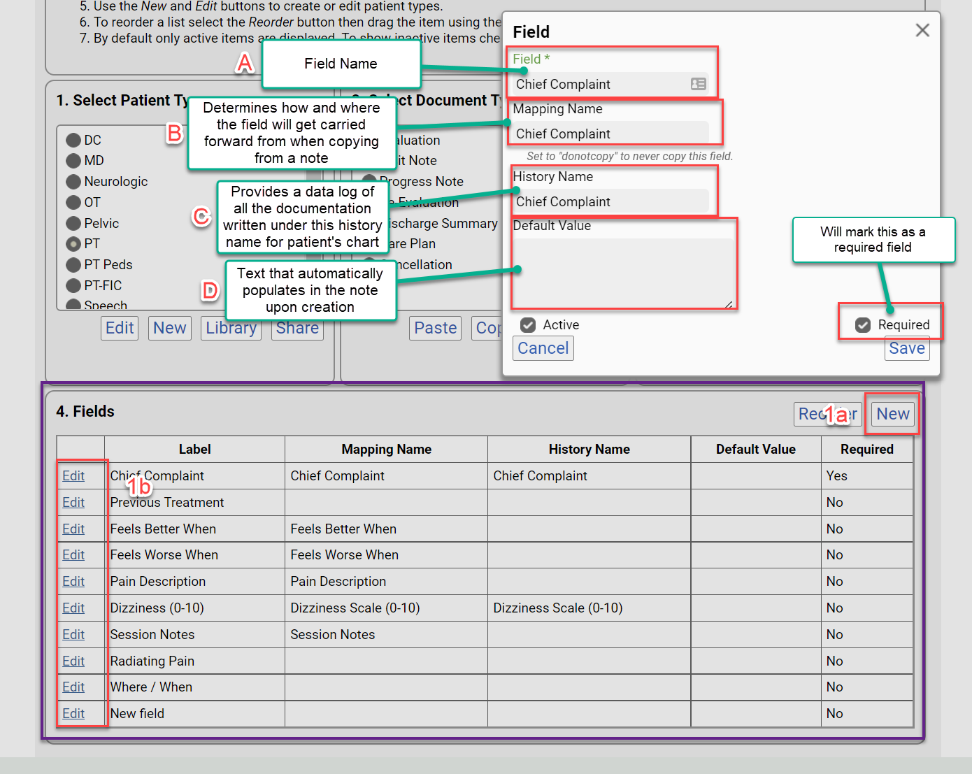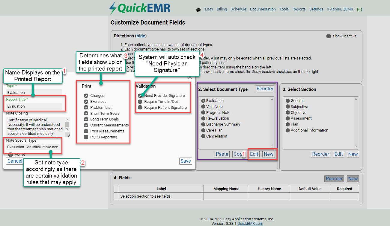 2. Determine the Note type *Particular note types will follow certain validation rules and settings 3. Check mark the fields that should show up on the printed format of the note 4. Check mark "Need Provider Signature" will auto check Need Physician Signature on the note.