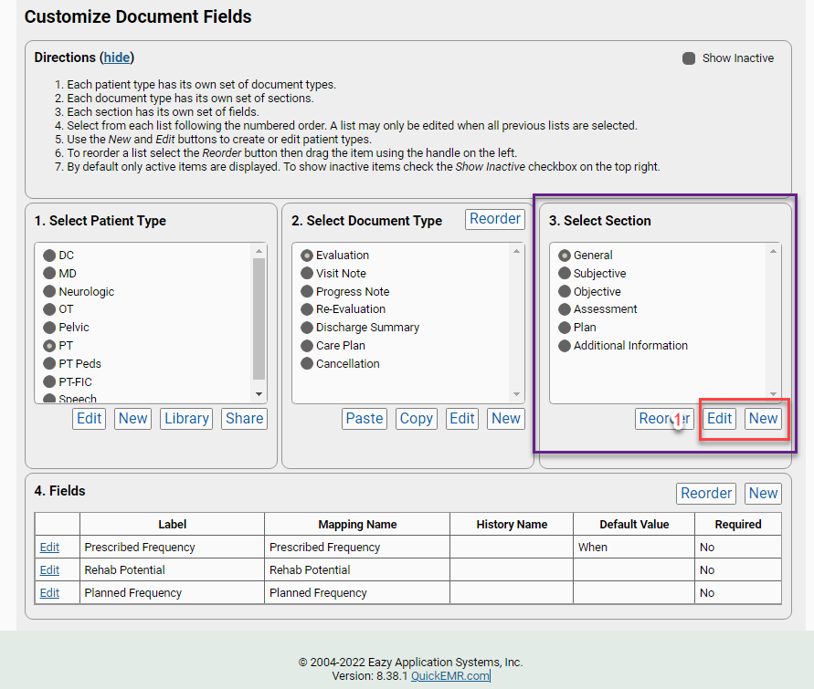 **Click on the Section to open the corresponding fields. 1. Click edit or new to create or update a field a. The field name will be the subheading