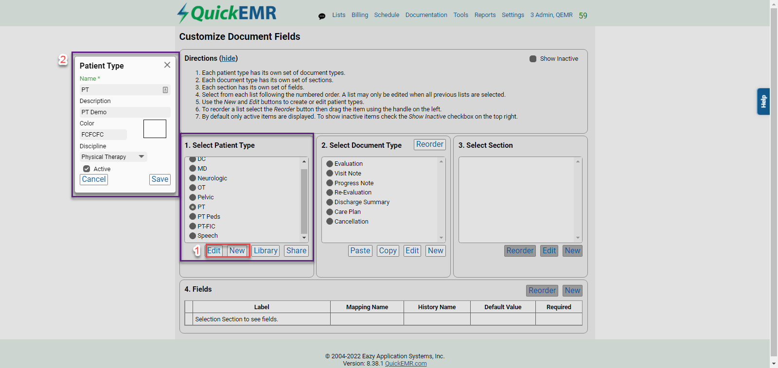 1. Click create or or edit to update an existing patient type 2. Assign a name and Discipline to the patient type if necessary