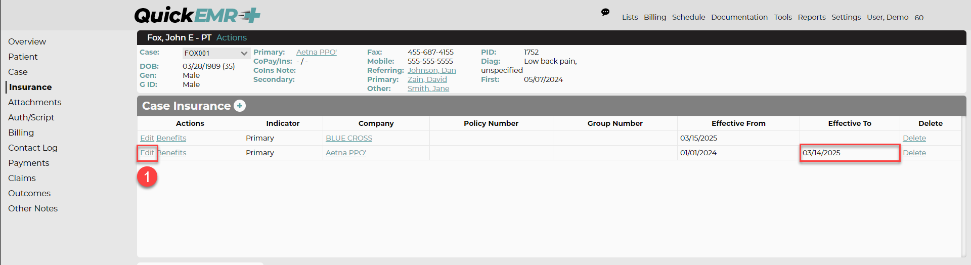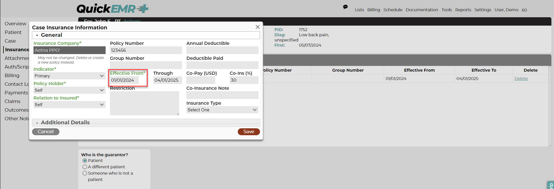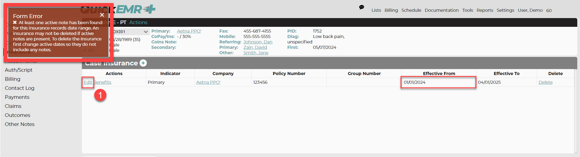 *If there is a active note on file and the user needs to delete a insurance, the "Effective from" date will need to be changed