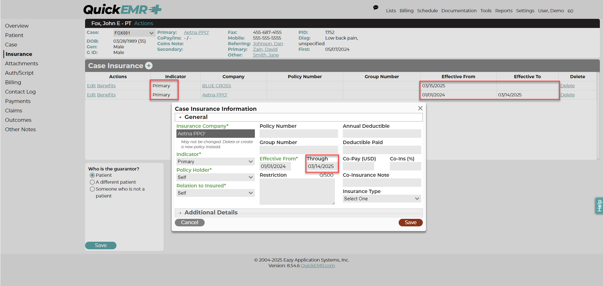 1. Updating the effective through date will allow the user to add another primary on file and make the previous primary insurance inactive.