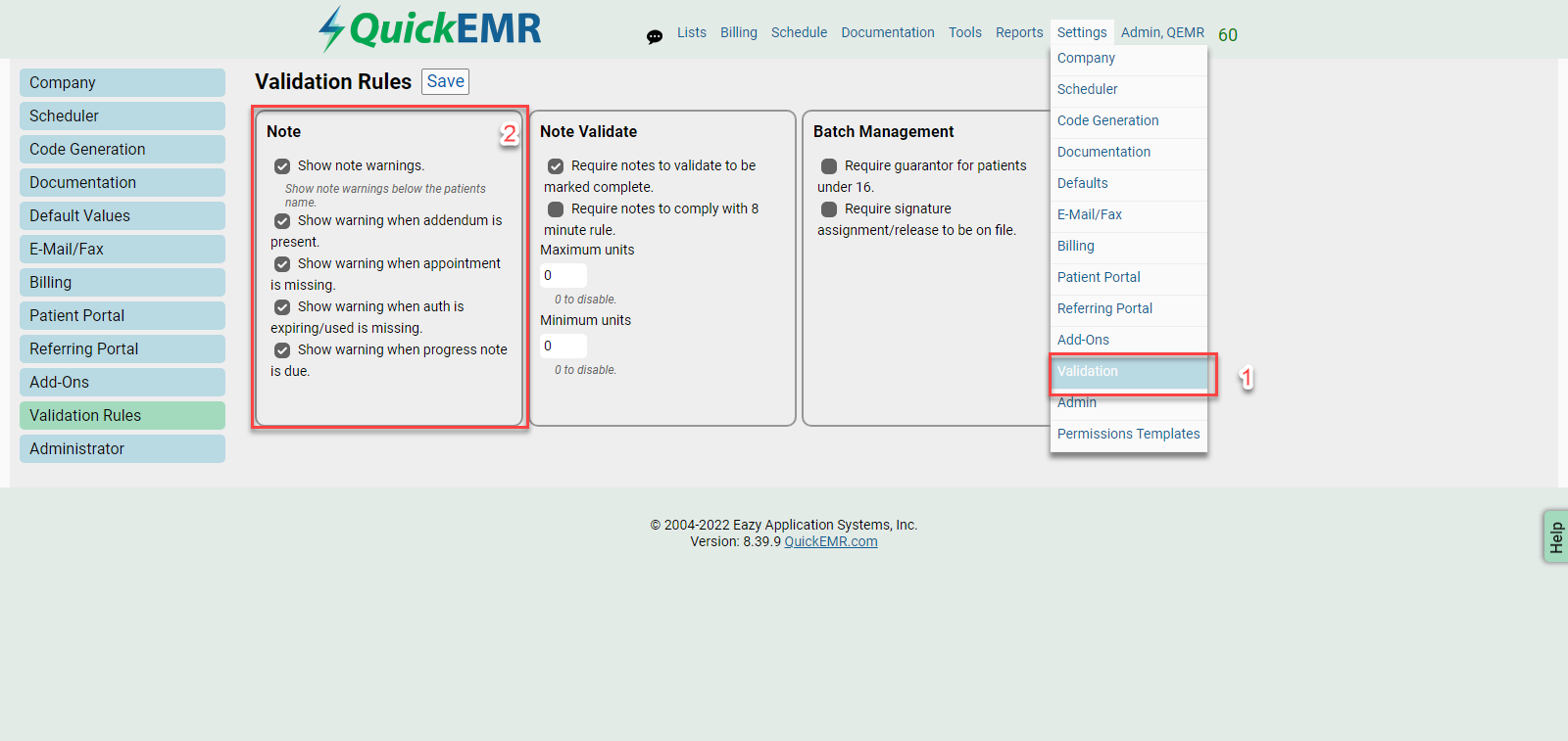 A few optional validation rules can be applied before exporting a note. Validation Rules: Where to go? 1. This can be found under Settings -> Validation 1. Check marking the following validation rules will require this information before a note can ...
