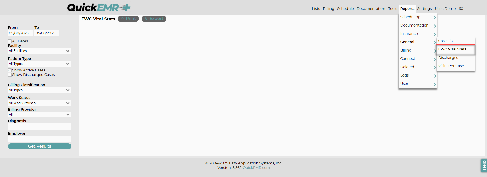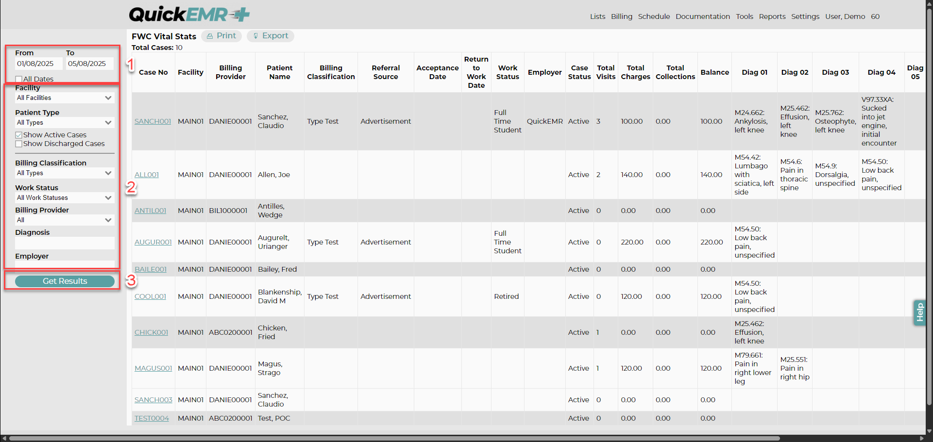 2. Enter any other parameters, such as specific facility, Active/Discharged Cases, Work Status, and Employer.