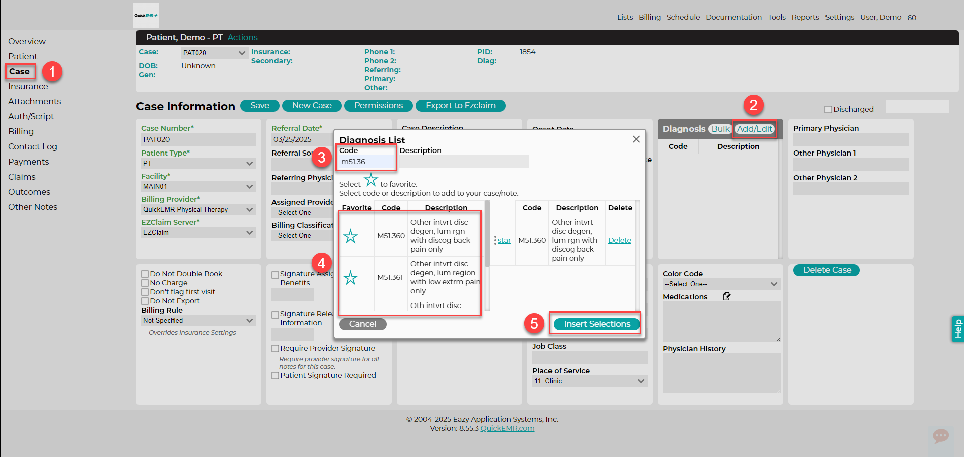 A modal window will open showing a list of diagnosis codes. The available diagnosis are on the left while the currently selected diagnosis are on the right. Enter some text into the "Code" or "Description" filters to narrow down the list. When you find the desired value select it on the left to make it populate on the right. If the wrong value is selected use the "Del" link to remove it from the selections. When finished select "Insert Selections" button at the bottom right of the modal.