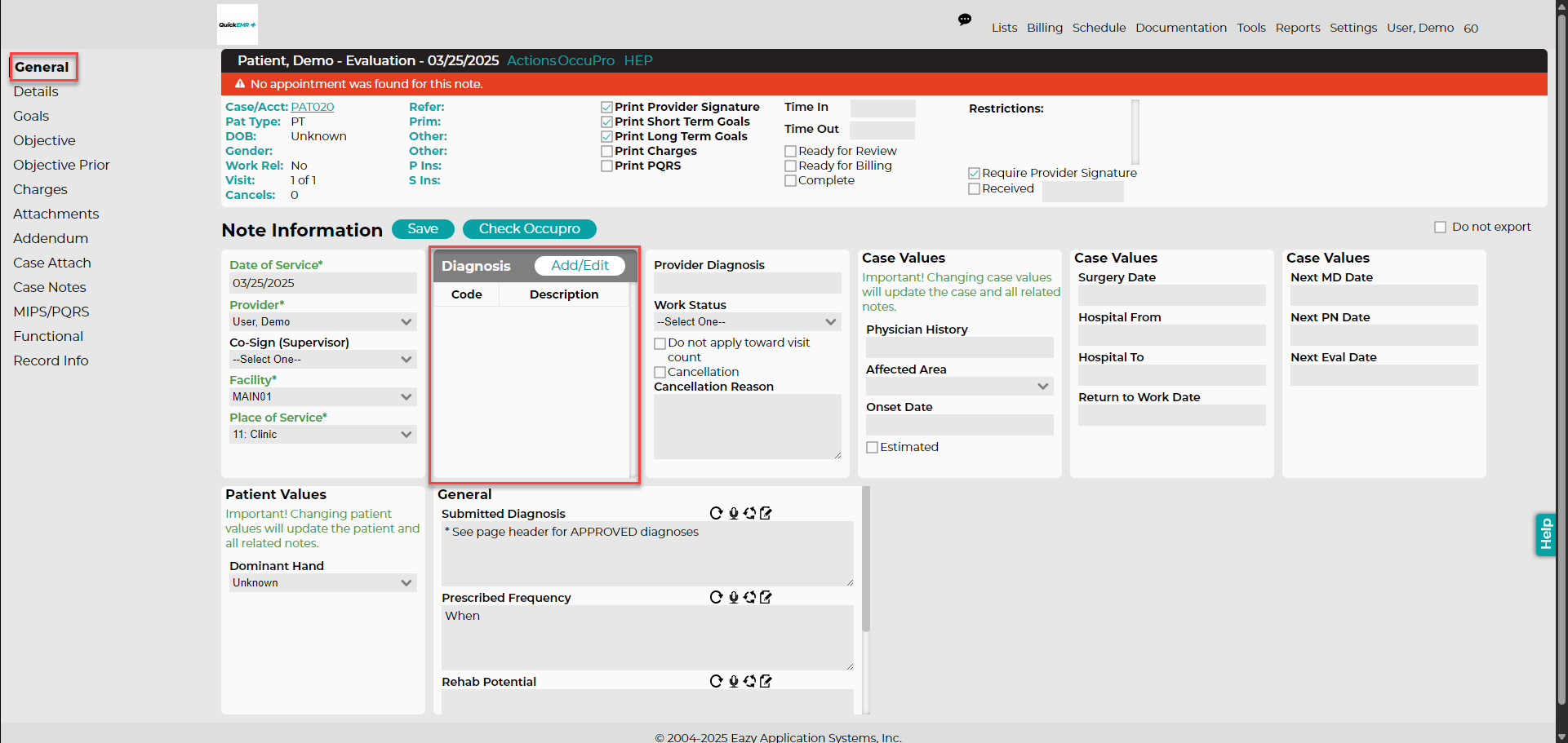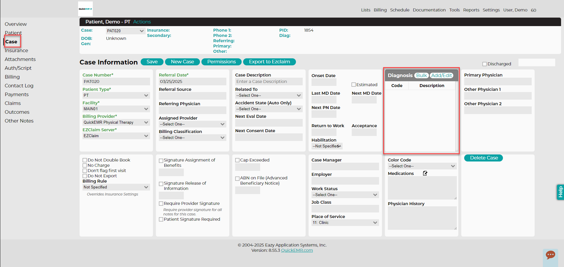 Upon creating a case the Diagnosis Codes will be empty. Select the "Add/Edit Diagnosis" button (as shown in the screenshot below.