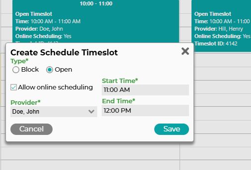 1. After creating a timeslot on the template, it will automatically appear on the appointment book as an available (open) timeslot.