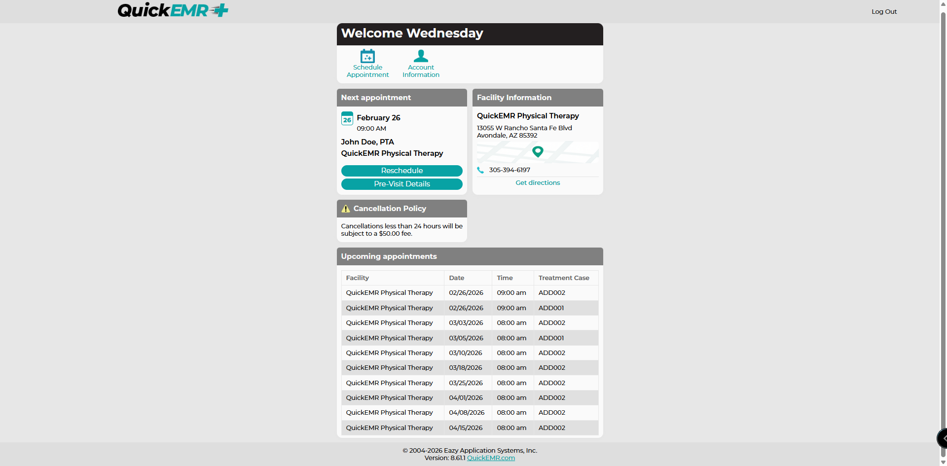 The clinic’s cancellation policy is managed under Settings → Company and is displayed to patients on their dashboard.