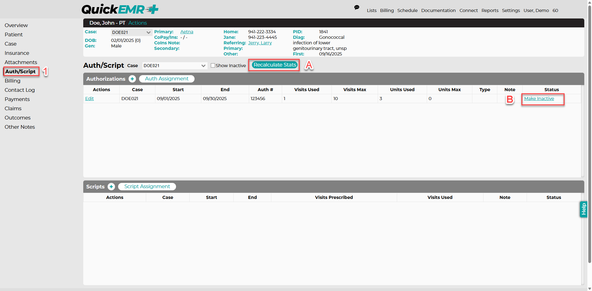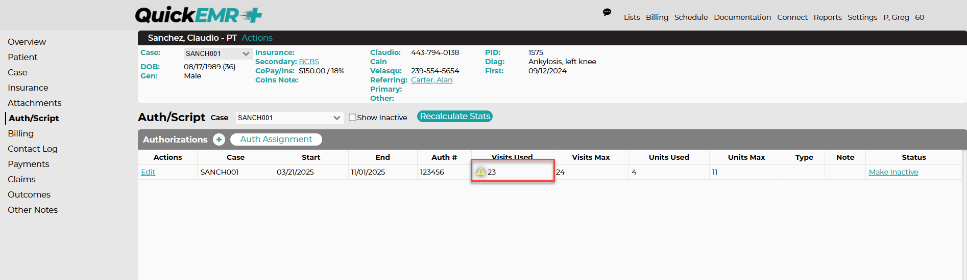 On the Auth/Script tab within the patients Case, you can view their current authorizations, as well as the Max Visits and Visits Used. When the patient is within three visits remaining, you will see a warning symbol appear next to the Visits Used count. When the patient has reached their current Max Visits or have exceeded that threshold, you will see a stop symbol appear next to the visit count.