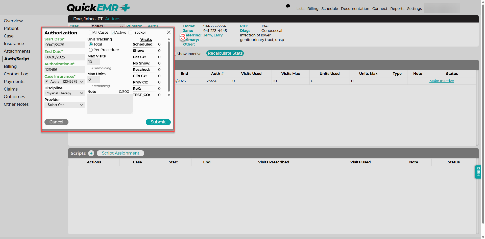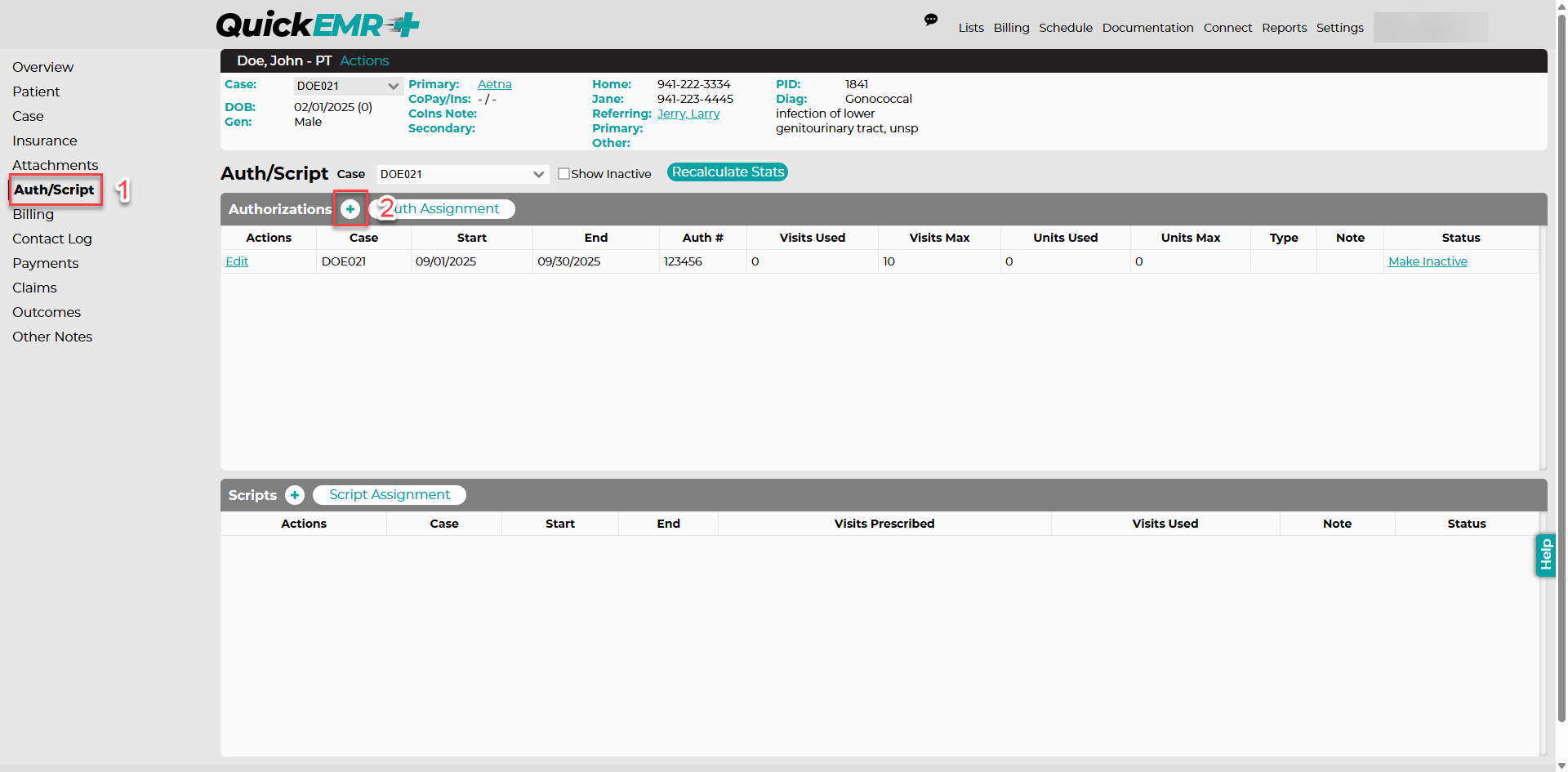 1. Open the patient’s Case → go to the Auth/Script tab. 2. Click Add to open the Authorization modal.