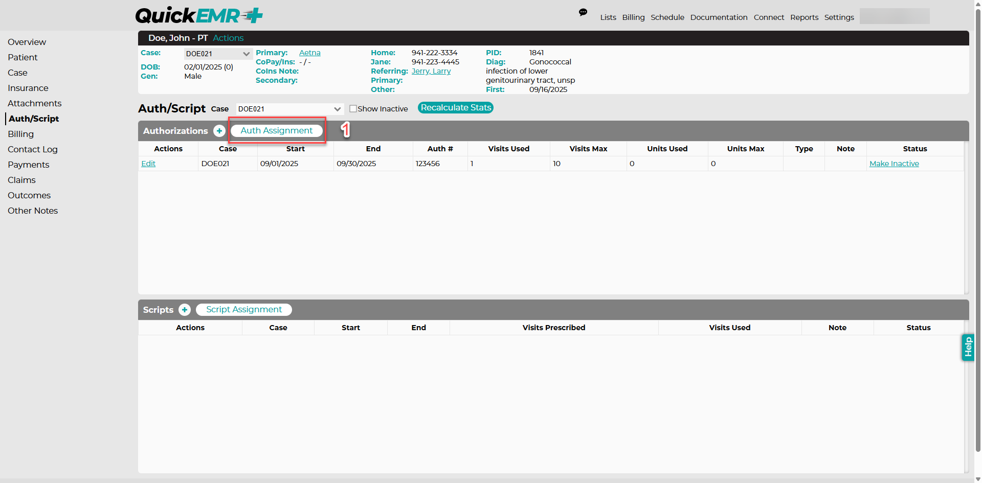 1. Open the patient’s Case → Auth/Script tab and Click “Auth Assignment.