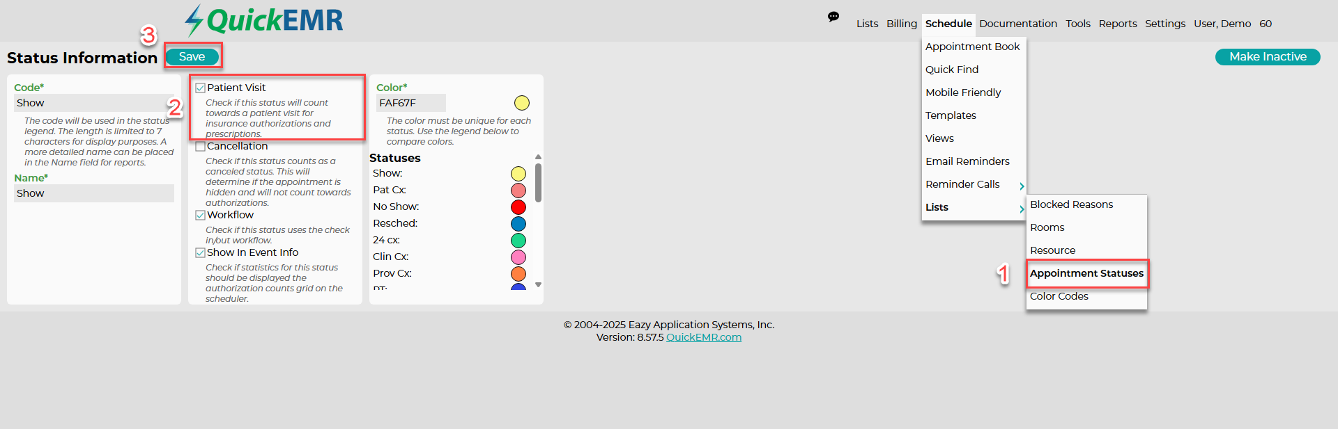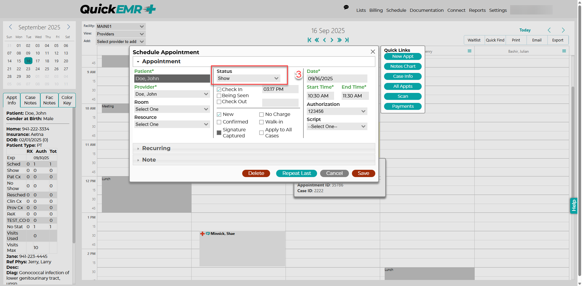 3. When an appointment status that represents a real patient visit is applied (e.g., Show), QuickEMR auto-calculates the remaining visit (and, if applicable, unit) counts for that authorization.