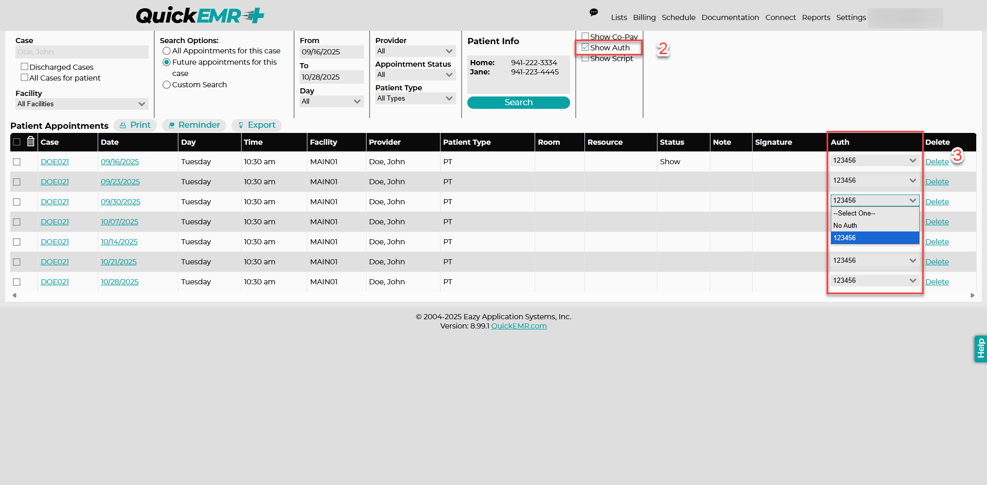 3. In the Auth column, users can select the authorization for each appointment using the dropdown.