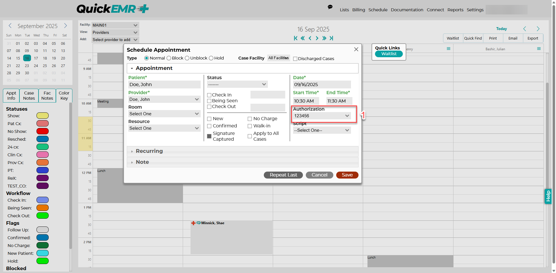 When you create an appointment, QuickEMR automatically links the relevant authorization to that visit. You can still change the authorization manually on the appointment if needed.