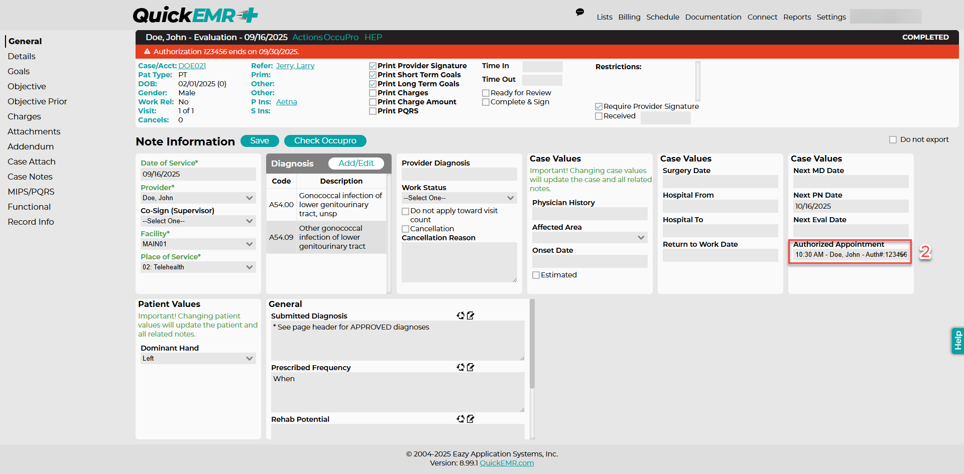 2. When a provider creates a note for that visit, the authorization set on the appointment carries over and is pre-selected on the note. If a note is created without a prior appointment, QuickEMR selects the most relevant authorization in the background to streamline workflow.