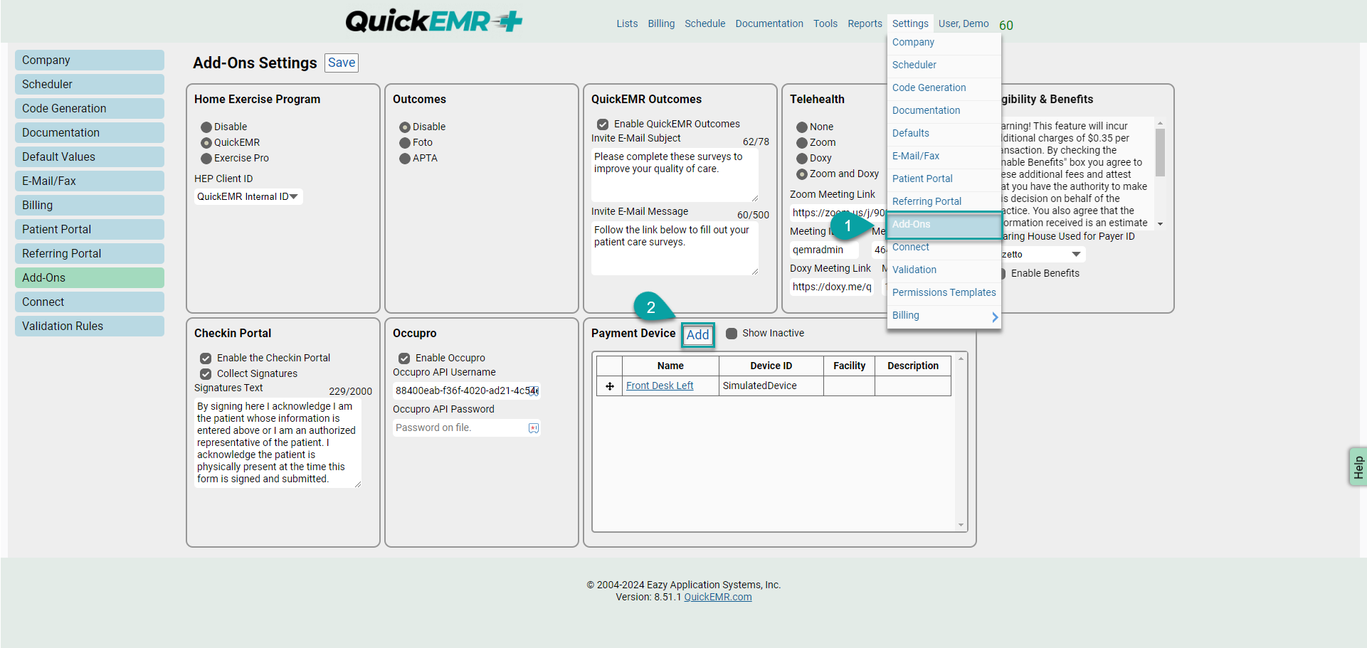 1. The next thing you will need to do is navigate to Settings --> Add Ons. Once you are there, you will notice a box for "Payment Device". Click the Add button to begin adding your new credit card device.