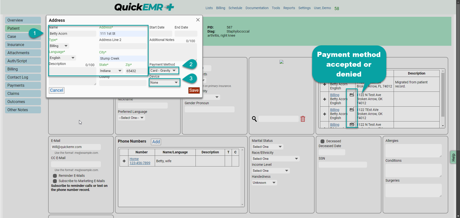 1. To save a payment method into QuickEMR, you will first need to navigate to the Patient tab within their case file. Once there, find the Addresses box and select "Add".