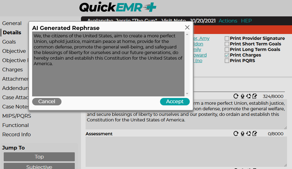 Artificial Intelligence has now come to QuickEMR. We have partnered with OpenAI to bring voice transcription and text rephrasing to the note Details screen.