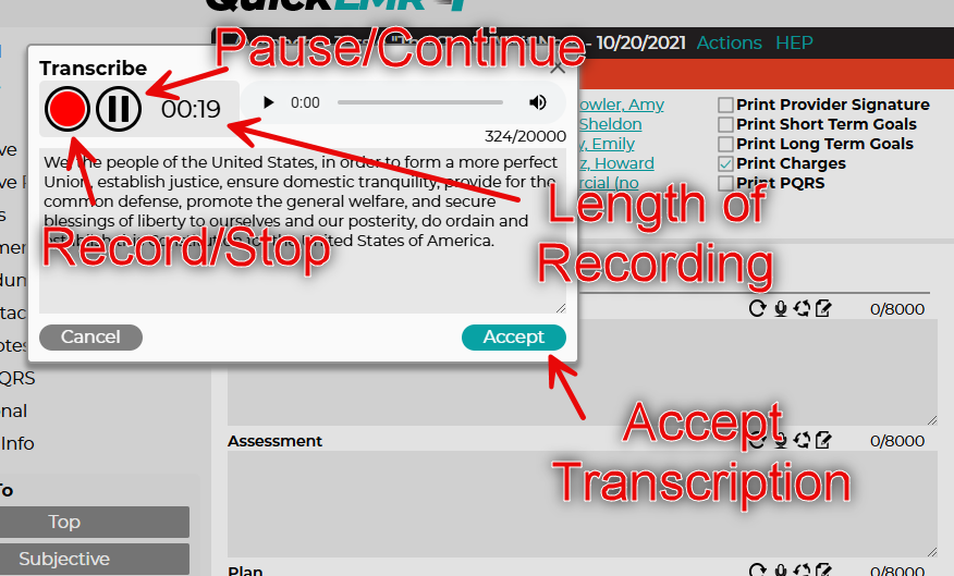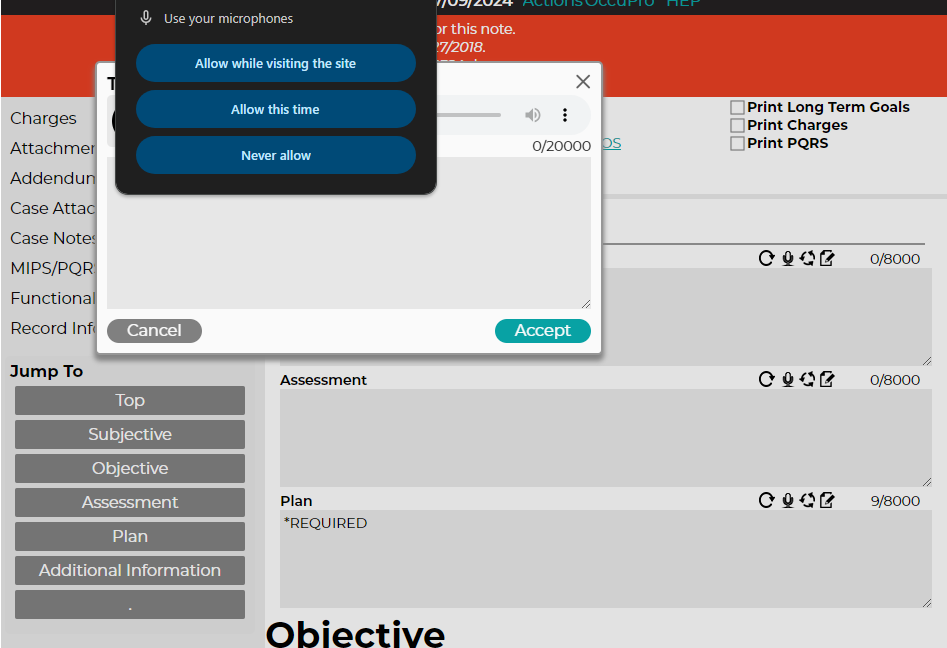 With the transcribe enabled on both the global and the user settings, you may now take advantage of the transcription on the note Details tab. Two new icons will now be visible above each field's text box. The microphone icon will activate the transcribe dialog, while the refresh arrow will rephrase the text.