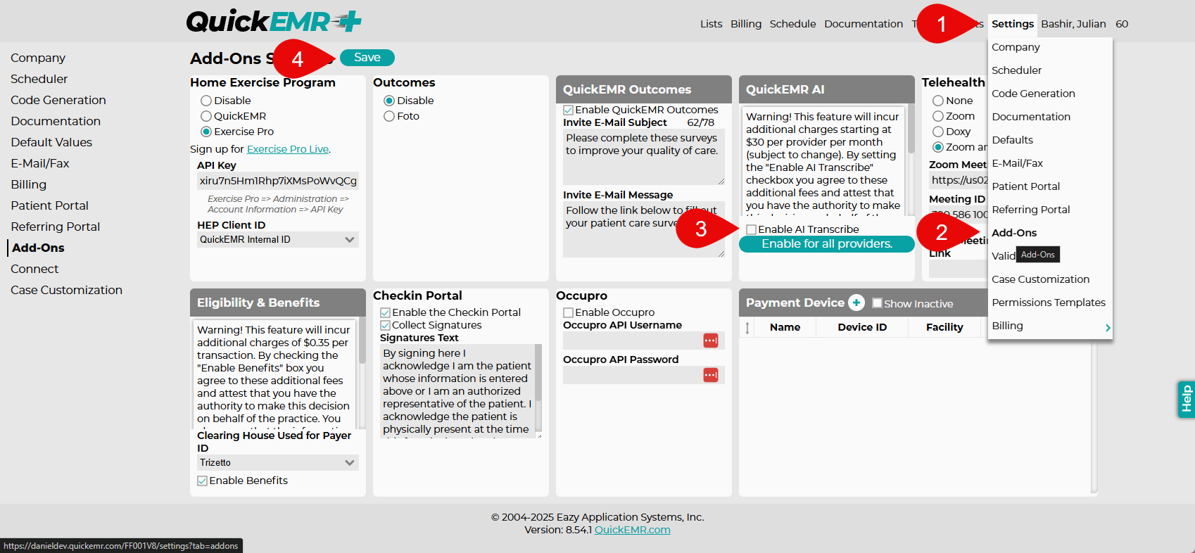 To enable the feature, make sure your user account has the appropriate permissions to View and Edit Practice Settings. Enabling this feature requires agreeing to the features terms of service and will incur additional fees. The cost to enable this feature is $30.00 per month for each full-time provider under which it is enabled. The cost will be prorated for part-time provider based off of the number of notes that the user completes.