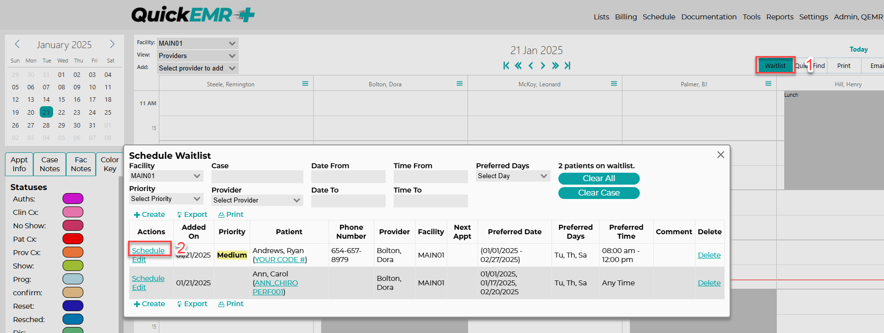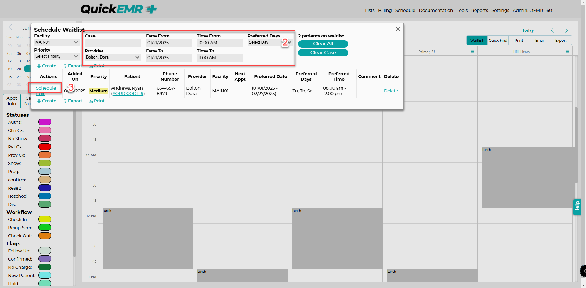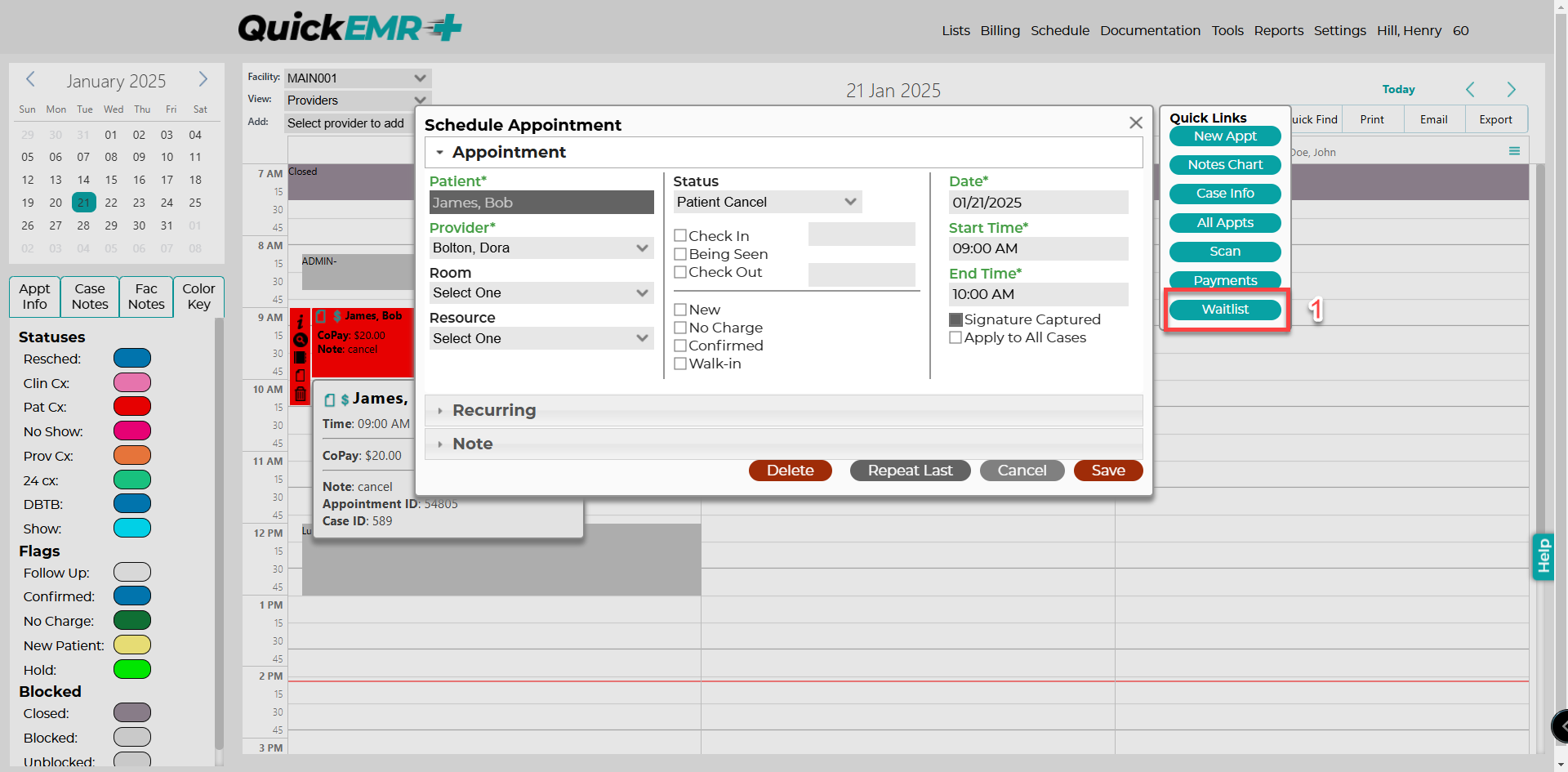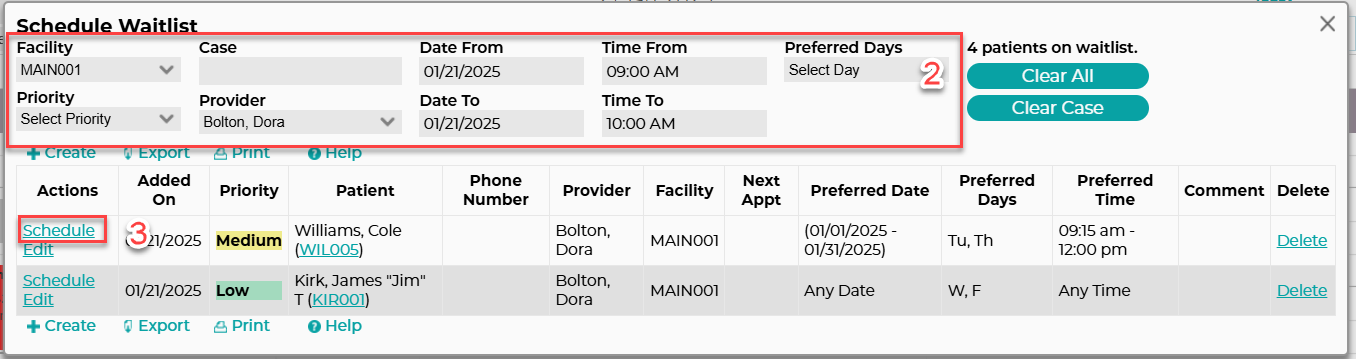 If an appointment has a designated cancellation status, click on the appointment and users will find a "Waitlist' link located to the right 1. Click on the Waitlist link and we will see that our filters auto search for patient with availability for that same provider, day, and time.