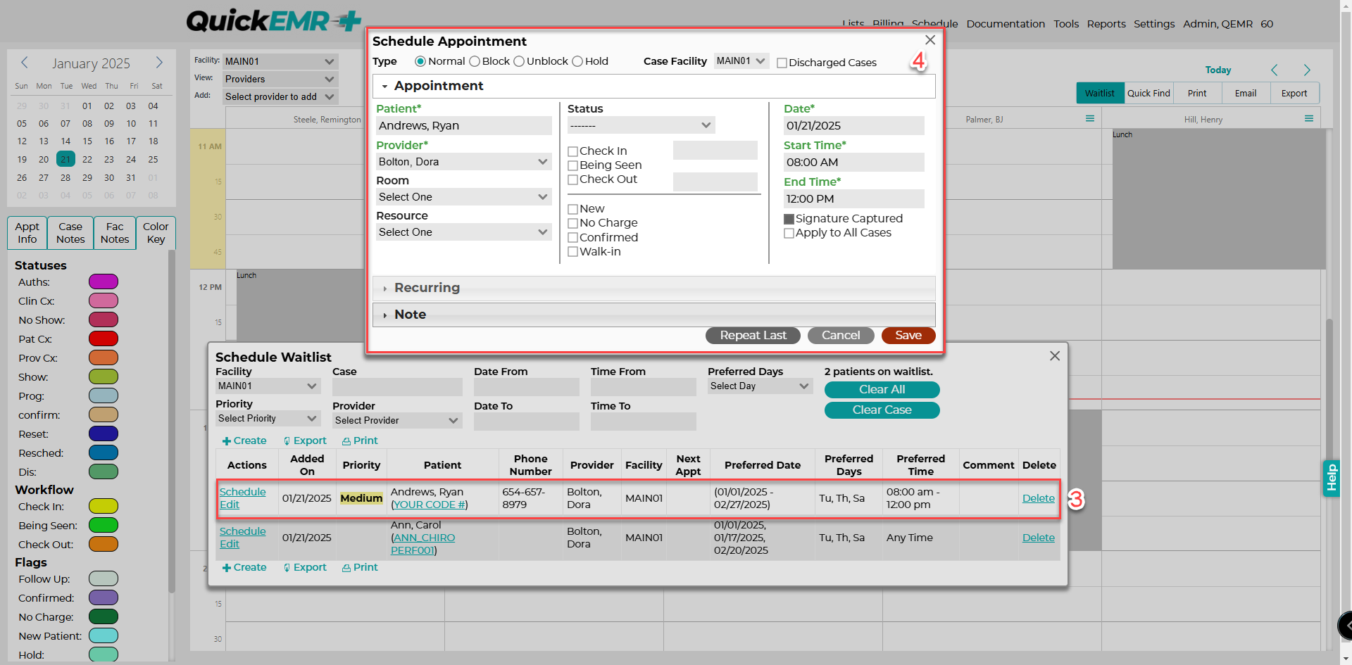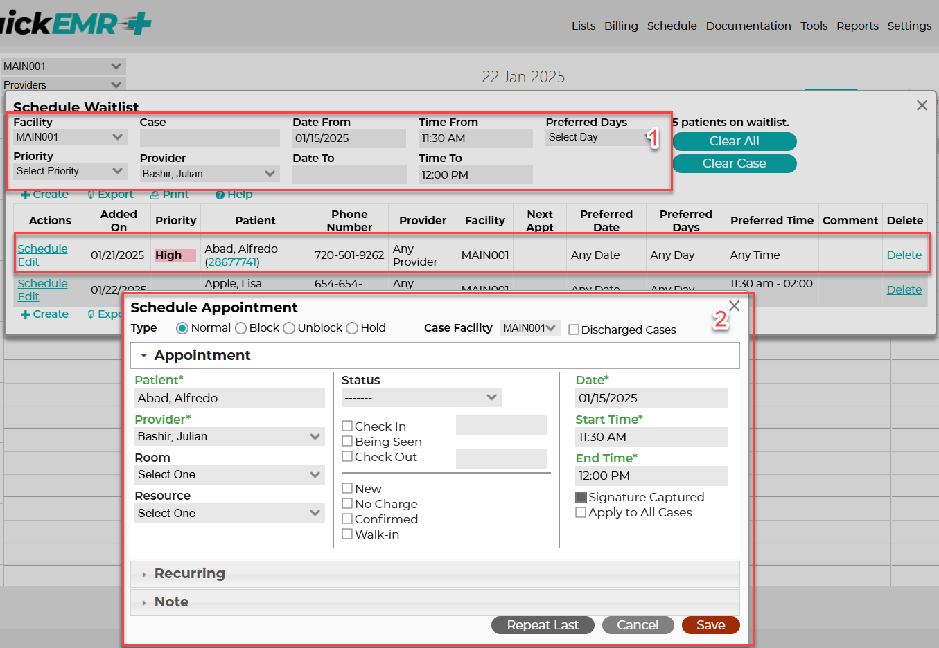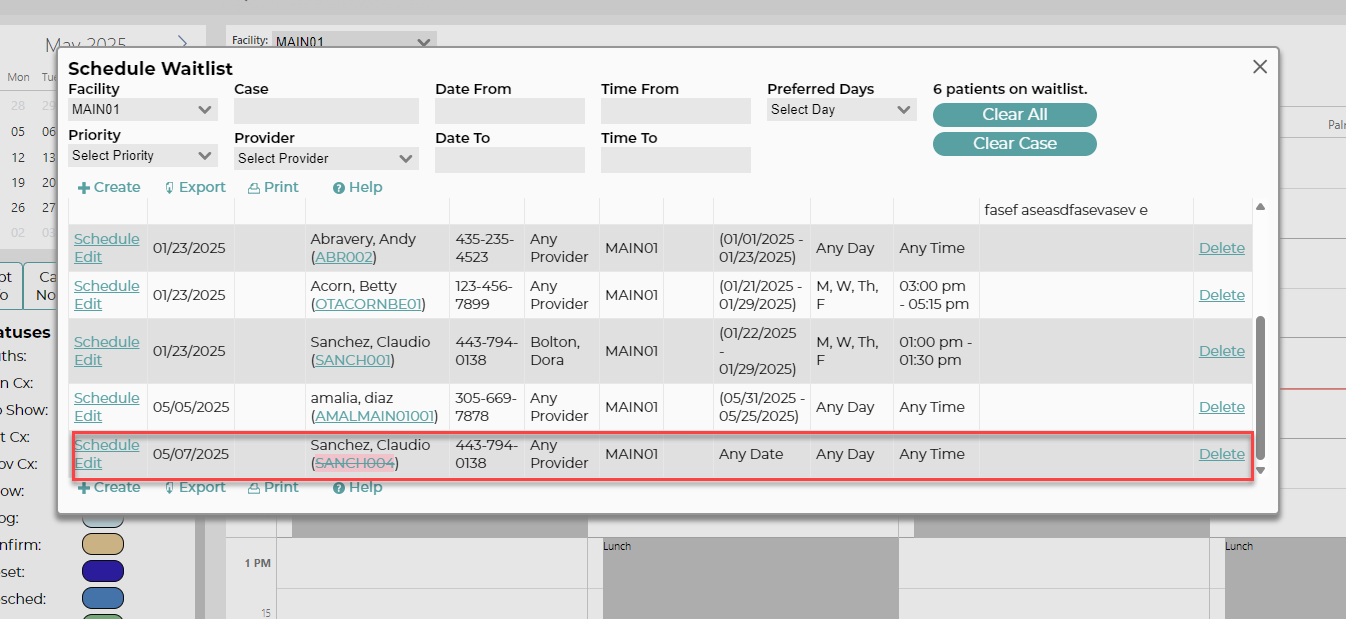 If an appointment has a designated cancellation status, click on the appointment and users will find a "Waitlist' link located to the right 1. Click on the Waitlist link and we will see that our filters auto search for patient with availability for that same provider, day, and time.