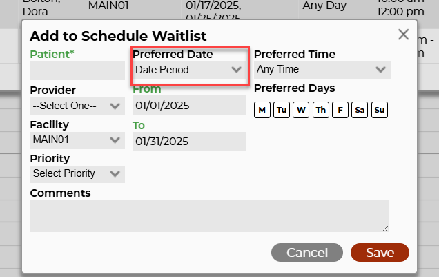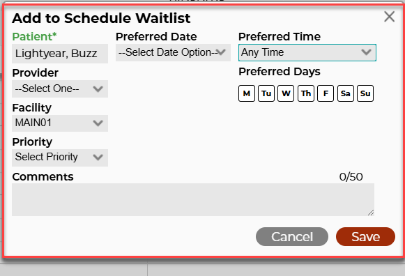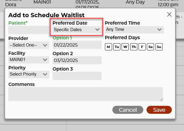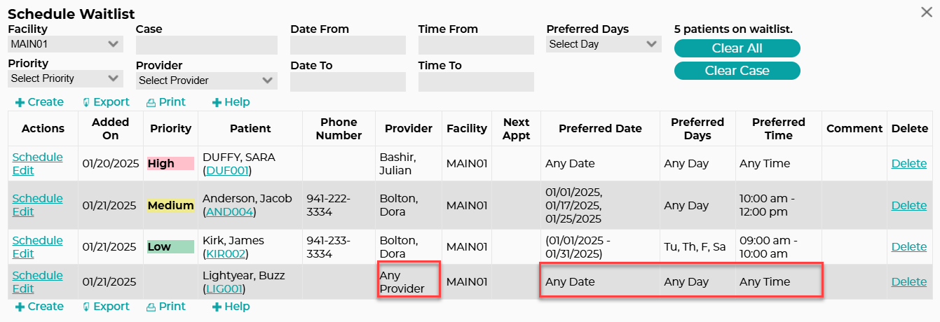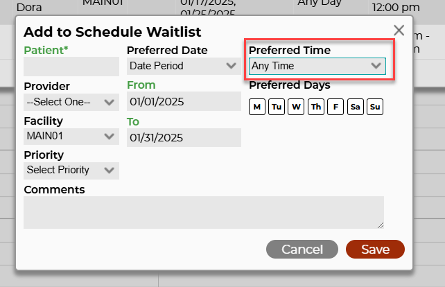 If any fields such as provider, preferred date, preferred time, or preferred days are left empty, they will automatically default to "Any" in the waitlist table.