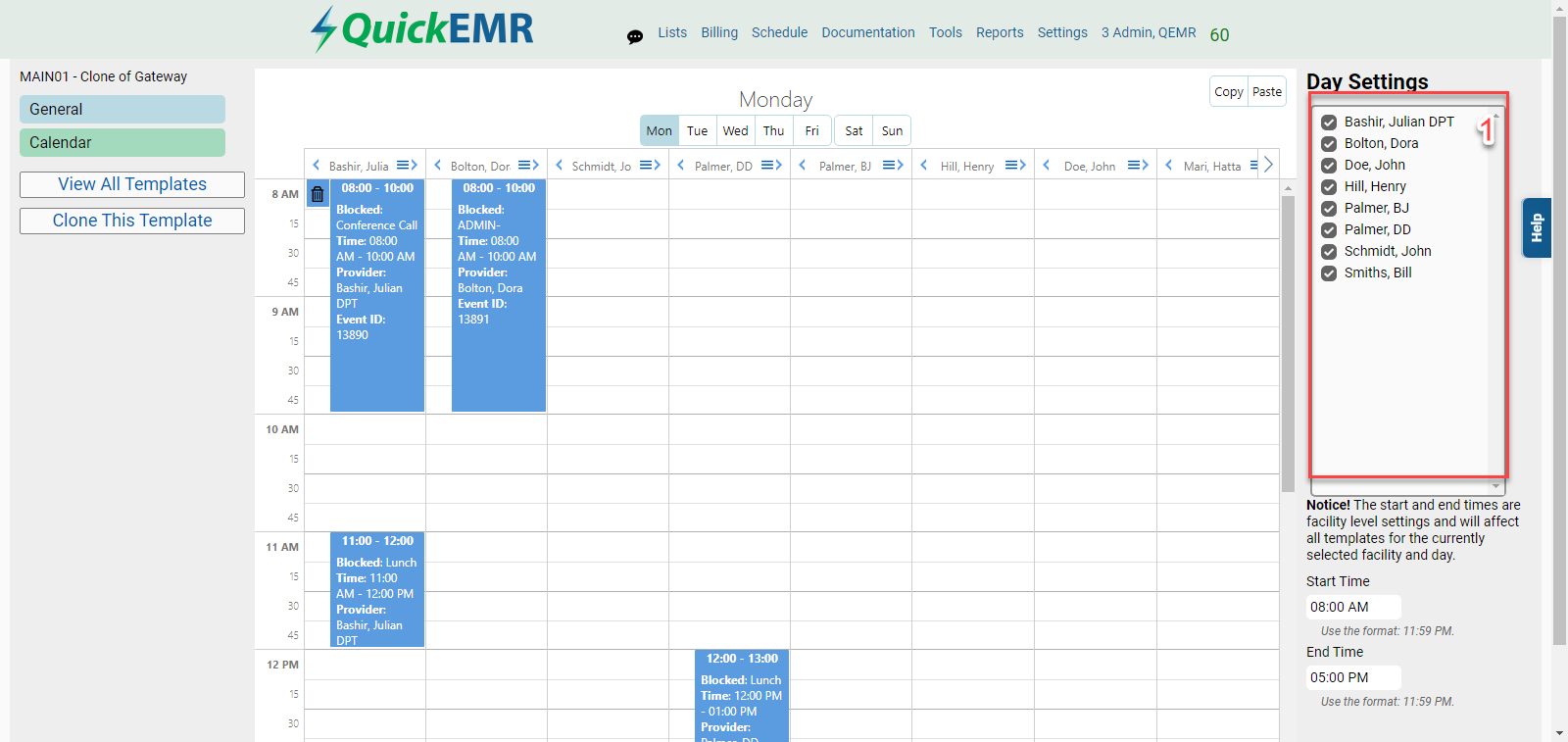 *If the provider's name is displaying on the template, but they are not listed in the box on the right under "Day Settings", the provider's account must've been made inactive before they were taken off the schedule. The providers account must remain active until this step is complete, and you may need to re-activate the provider's account.