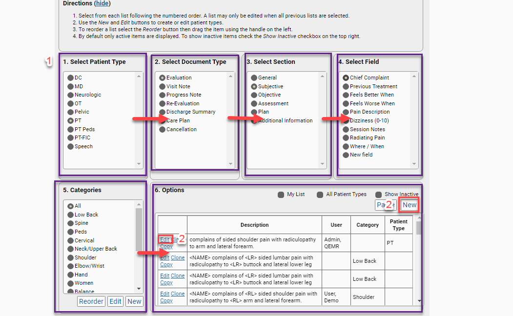 1. Select the Patient Type->Document Type ->Section->Field->Category.