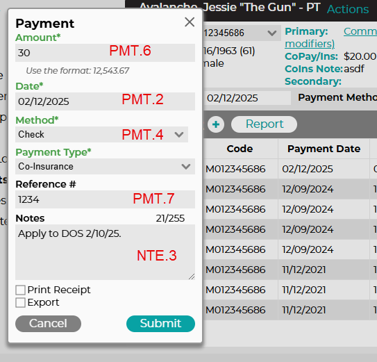 - Reference - Free text provided by the user about this payment. Usually a check number or CC verification code. See Screenshot PMT