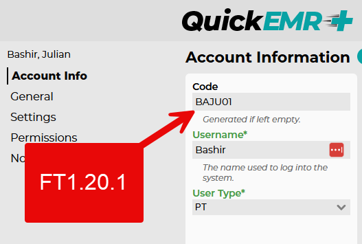 - ID - The unique user code from within QuickEMR. See Screenshot FT1.20.1