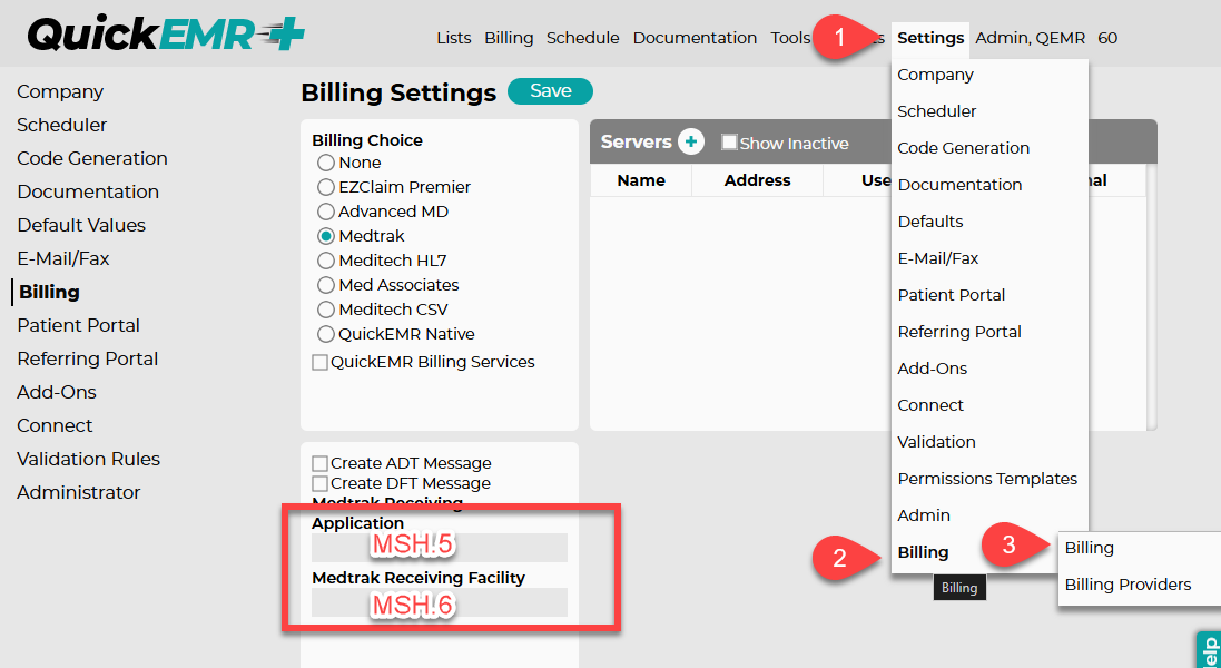 - Receiving Facility - Configurable in billing settings. Defaults to "Medtrak" (See screenshot MSH.5-6)
