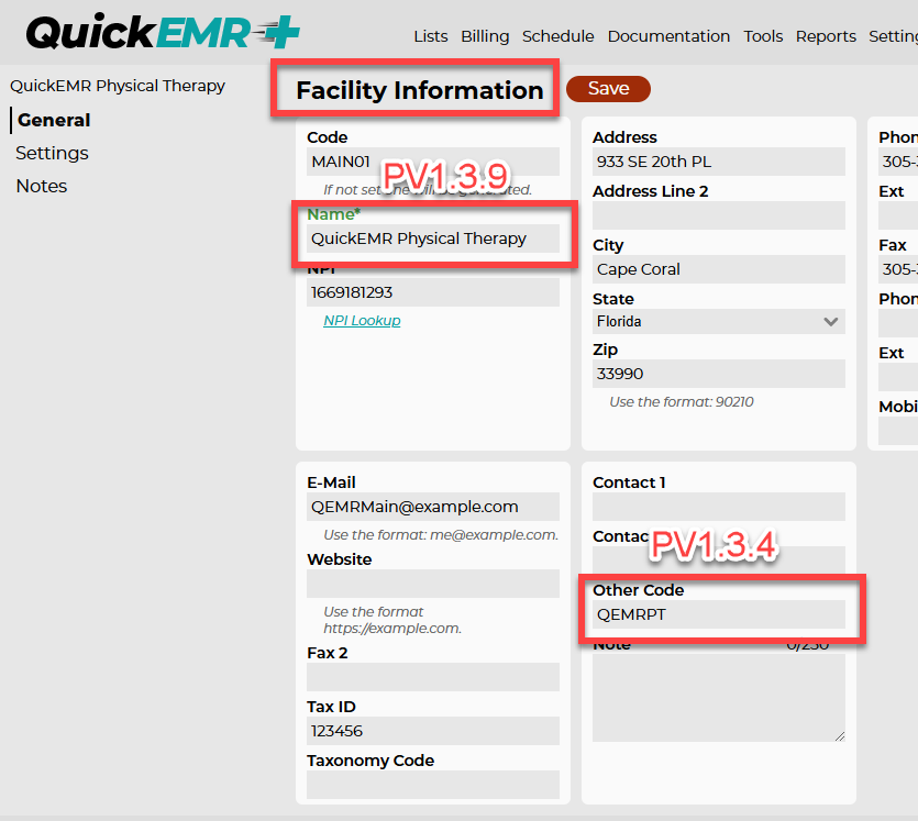 - Facility - The "Other Code" field for the facility specified on the note. (See screenshot PV1.3)